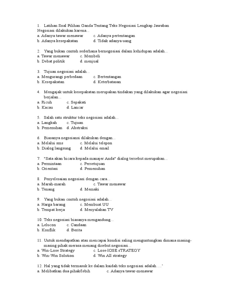 Di waktu yang bersamaan dia harus membantu kegiatan pramuka karena ia adalah salah satu pengurus inti pramuka. Berkunjung ke rumah kakek d. Contoh soal bahasa indonesia kelas x tentang teks negosiasi 1. Contoh soal pilihan ganda tentang teks negosiasi beserta jawabannya best wallpaper ideas website. Yang tidak termasuk struktur dari teks negosiasi ad.